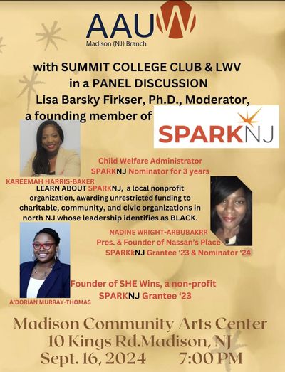 The nonprofit Madison Area AAUW Branch along with the Summit College Club (AAUW) and the League of Women Voters Morristown Area invite the public to this free program on Sept 16, 2024 at 7PM at the Madison Community Arts Center.